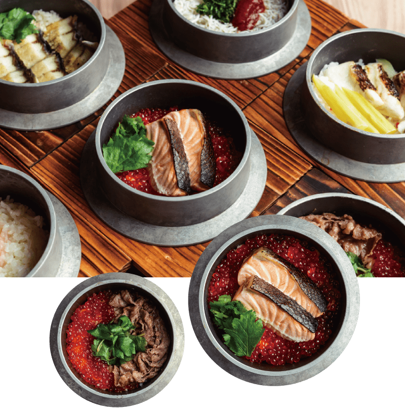 当店名物の釜飯は、店主厳選の食材を 贅沢に入れ、溢れる旨みをぎゅっと 炊き込みました。絶妙な温度加減で炊き 上げた釜飯は奥深い味わいを楽しめます。 釜飯にお出汁もお付けできるので、 全て茶漬けにもできます。